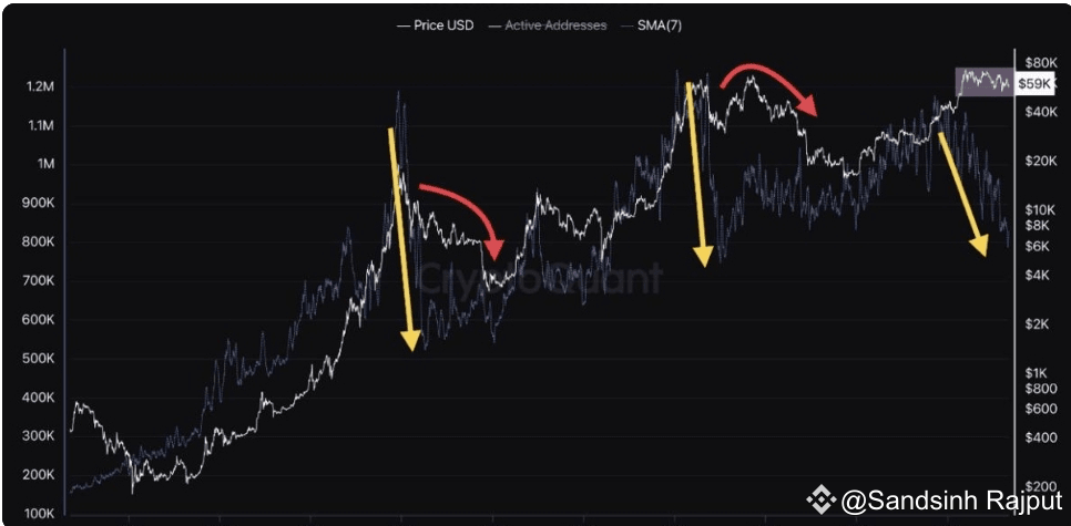 The number of Bitcoin $BTC active addresses — which represents the total number of active users on the network — has “declined significantly” since the beginning of 2024, a pattern that has historically formed after Bitcoin’s price peaked in the 2017 and 2021 bull cycles.