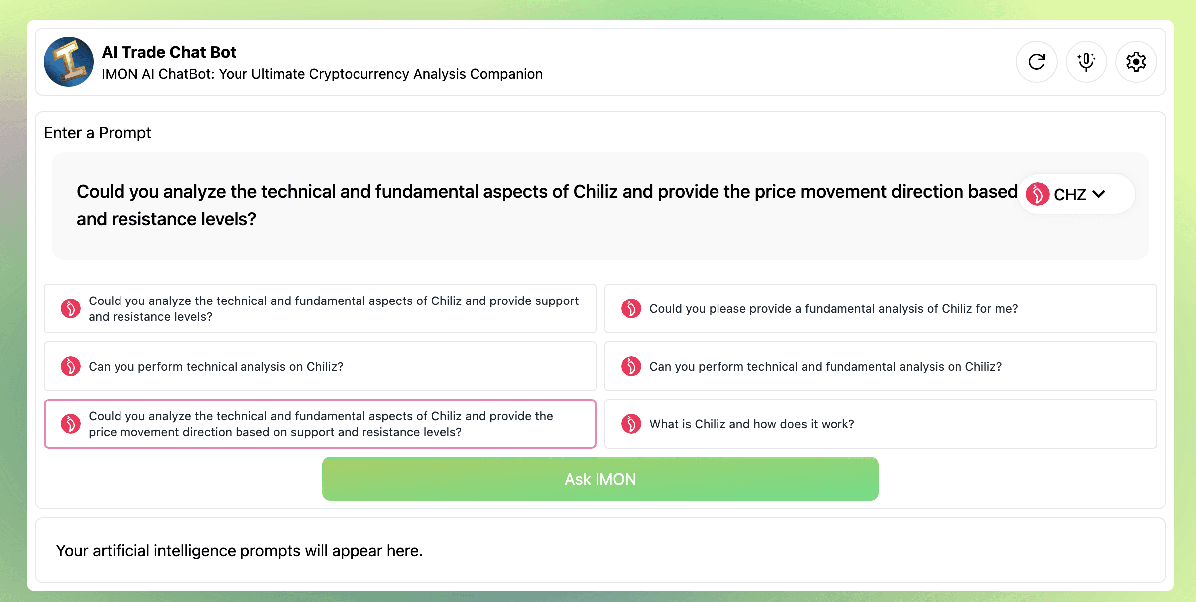 Based on the technical analysis indicators, it appears that Chiliz (CHZ) is currently experiencing a moderately bullish trend. The price is trading above the 20-day SMA and has recently crossed above the 50-day SMA, indicating potential positive momentum. The RSI is neutral, indicating a balanced market sentiment. The MACD shows bullish momentum.