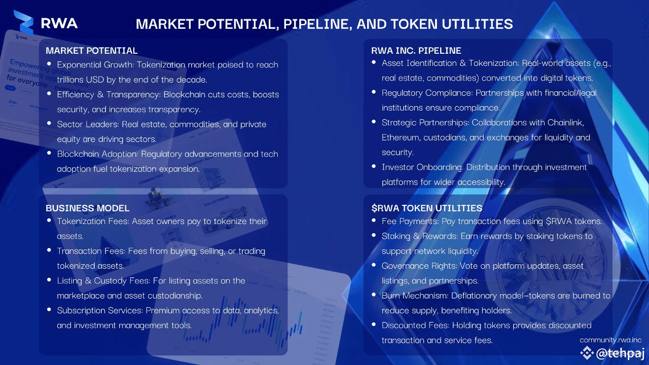 RWA Inc. is well-positioned to take advantage of the booming asset tokenization market with a structured pipeline, robust partnerships, and a sustainable business model. The $RWA token plays a pivotal role in creating an efficient, decentralized, and user-centric platform by offering tangible utilities like fee payment, staking rewards, governance rights, and a deflationary burn mechanism.