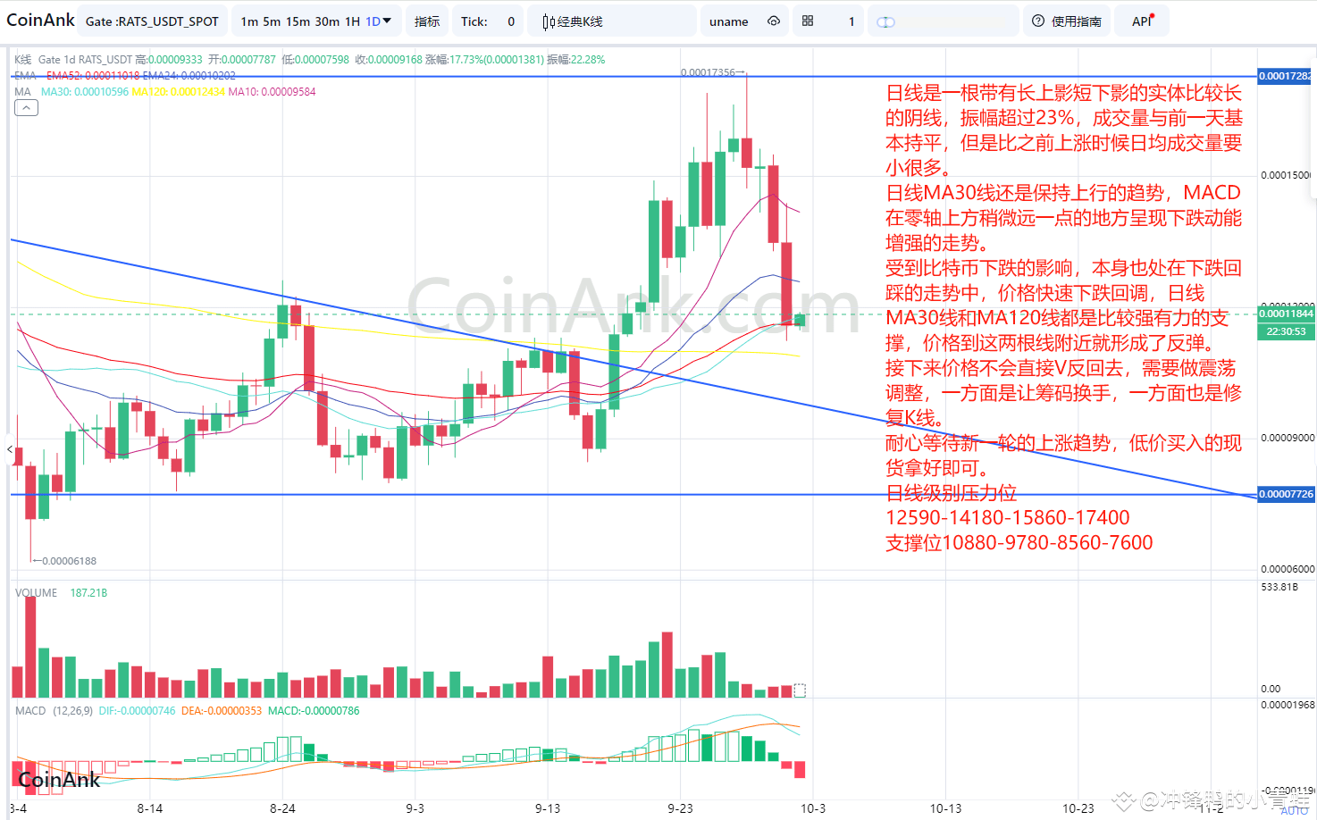 受到比特币下跌的影响,本身也处在下跌回踩的走势中,价格快速下跌回调,日线MA30线和MA120线都是比较强有力的支撑,价格到这两根线附近就形成了反弹。