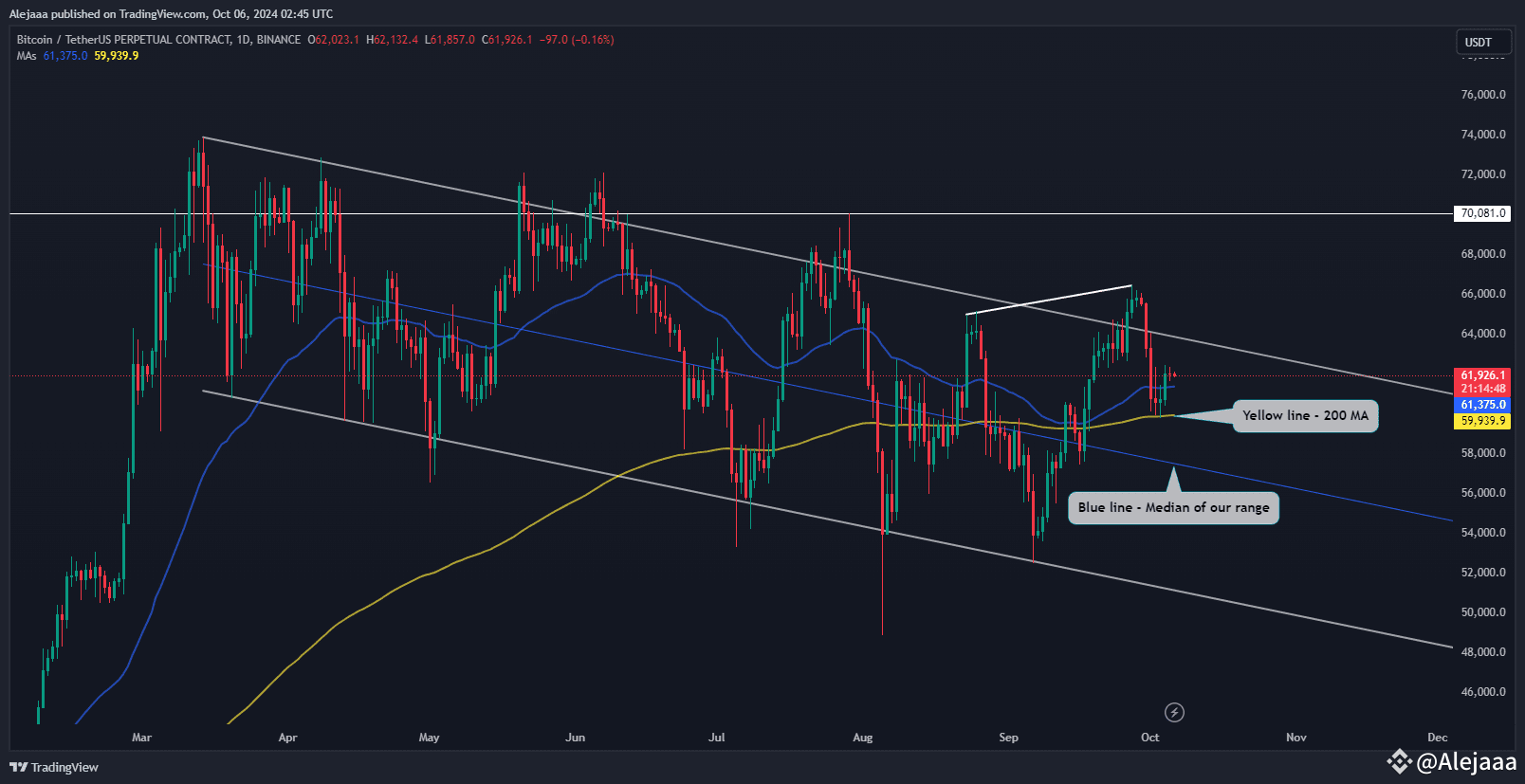 TL;DR: Based on historical data, two consecutive positive September and October could indicate a bullish trend. We're currently hoping for Bitcoin to confirm this analysis. Technically, we're eyeing a retest of the upper resistance, and if the market turns bearish, we'll look for Bitcoin to reach the 200MA (59.9k) again and the median (57.5k) of our range. Breaking below these levels could lead to a decline towards the bottom channel (51.7k).