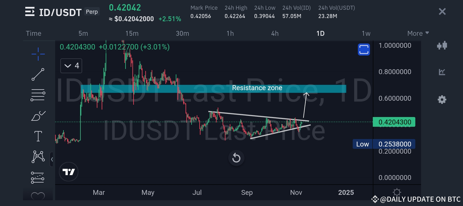 Ascending Triangle Pattern: ID/USDT is forming a classic ascending triangle, a bullish continuation pattern that indicates a possible upward move if it breaks through the resistance.