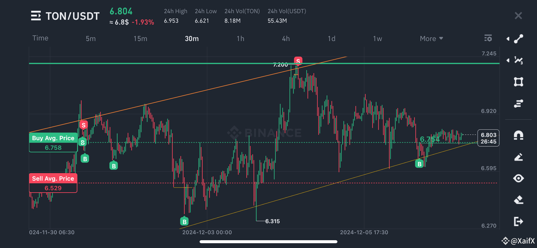 Looking at the 1-day chart for TON/USDT, we see a clear uptrend with a potential support level around $6.529 and resistance at $7.245. The current price sits comfortably above the 24-hour moving average, indicating bullish momentum.