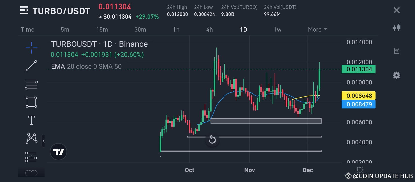 The TURBO/USDT pair has captured traders' attention with a +20.60% surge, showing significant bullish momentum. Let’s dive into the key technical details and what they could mean for the market.