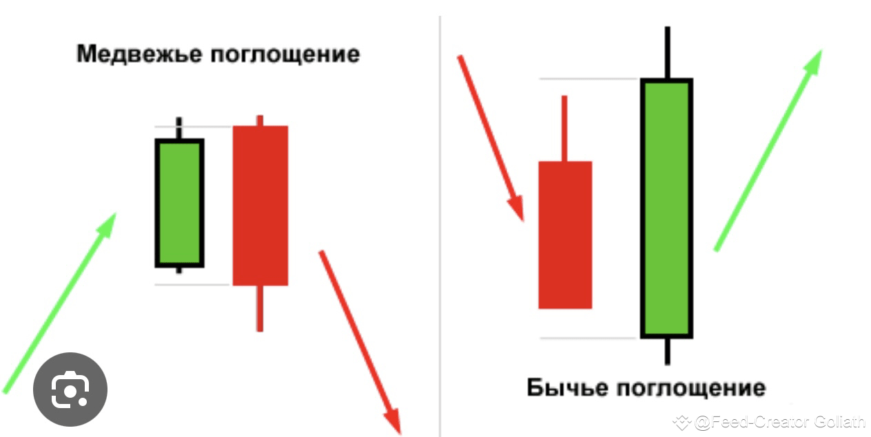 - Поглощение (Engulfing): Бывают бычьи и медвежьи поглощения. Если бычье поглощение происходит после падения, это может указывать на разворот вверх. Медвежье поглощение — на разворот вниз.