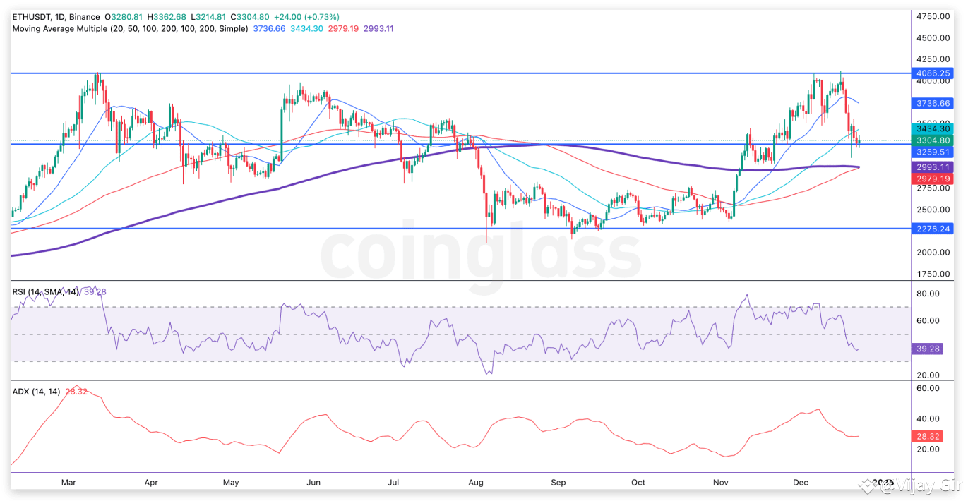 Despite the downturn, 78% of ETH holders are still in profit. Technical analysis highlights critical support at $3,260. A drop below this level could push prices to $3,000, where the 200-day moving average might offer stability. Indicators like RSI (39.28) and ADX suggest bearish momentum, with RSI nearing oversold territory.