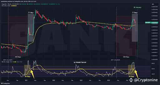DOGE experienced a two-week drop, moved sideways, and peaked after 77 days from the local top.