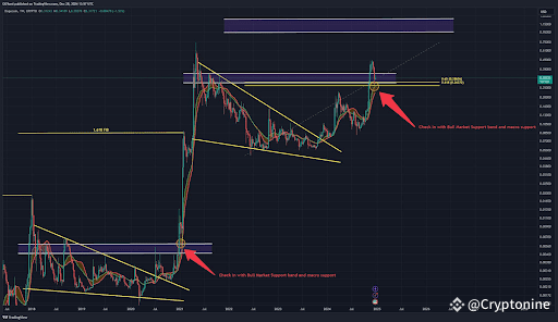 DOGE recently retested the $0.26 zone, aligning with the macro golden pocket and Bull Market Support band.