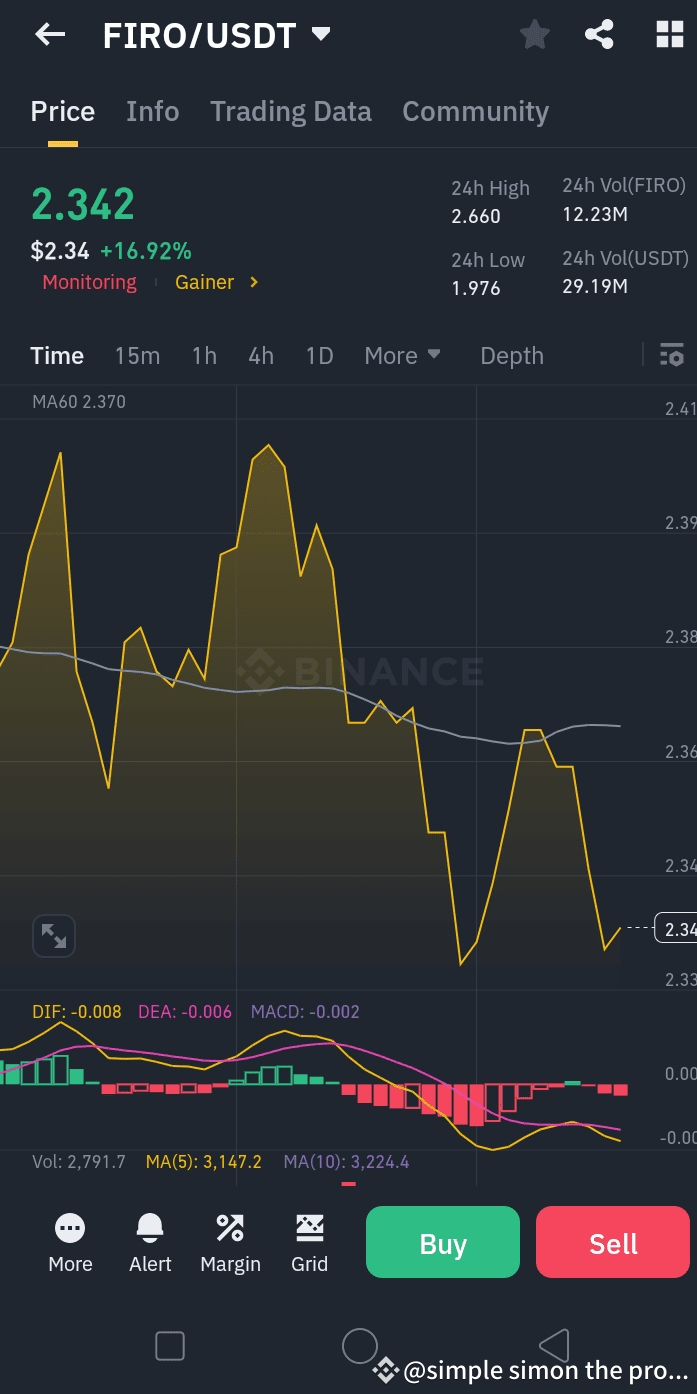 - *Price Movement:* The *current price* of FIRO is around *2.34*, with *positive momentum* in the last 24 hours. It’s currently testing the *2.35 resistance level* and could potentially rise further if it maintains this upward pressure. 📈