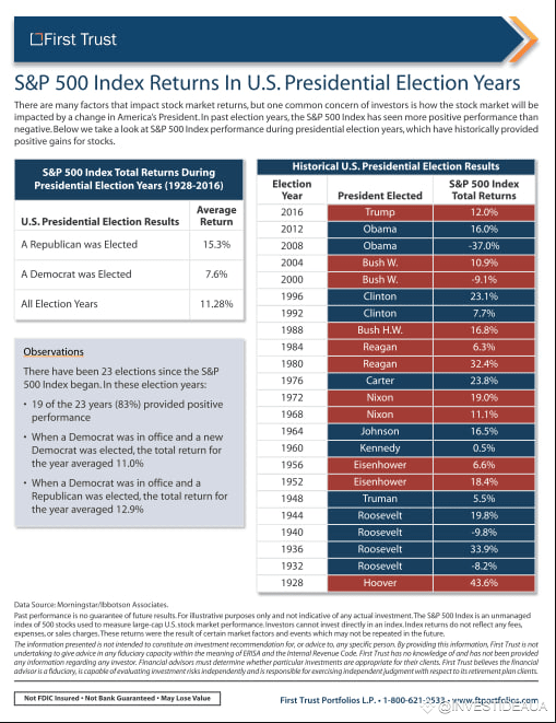Привожу статистику по годовому доходу фондового рынка в первый год после избрания президента США от демократической или республиканской партии. Статистика охватывает период с 1928 года, почти 100 лет.