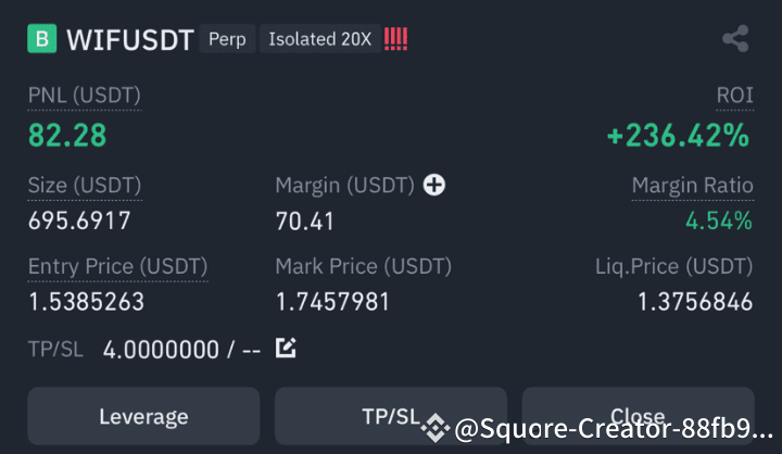 > "Trading WIFUSDT with 20x isolated leverage. 📊 Current PNL: +$82.28. Learning about risk management and position sizing is key in leveraged trading. #CryptoTrading #WIF #USDT #LeveragedTrading #RiskManagement"