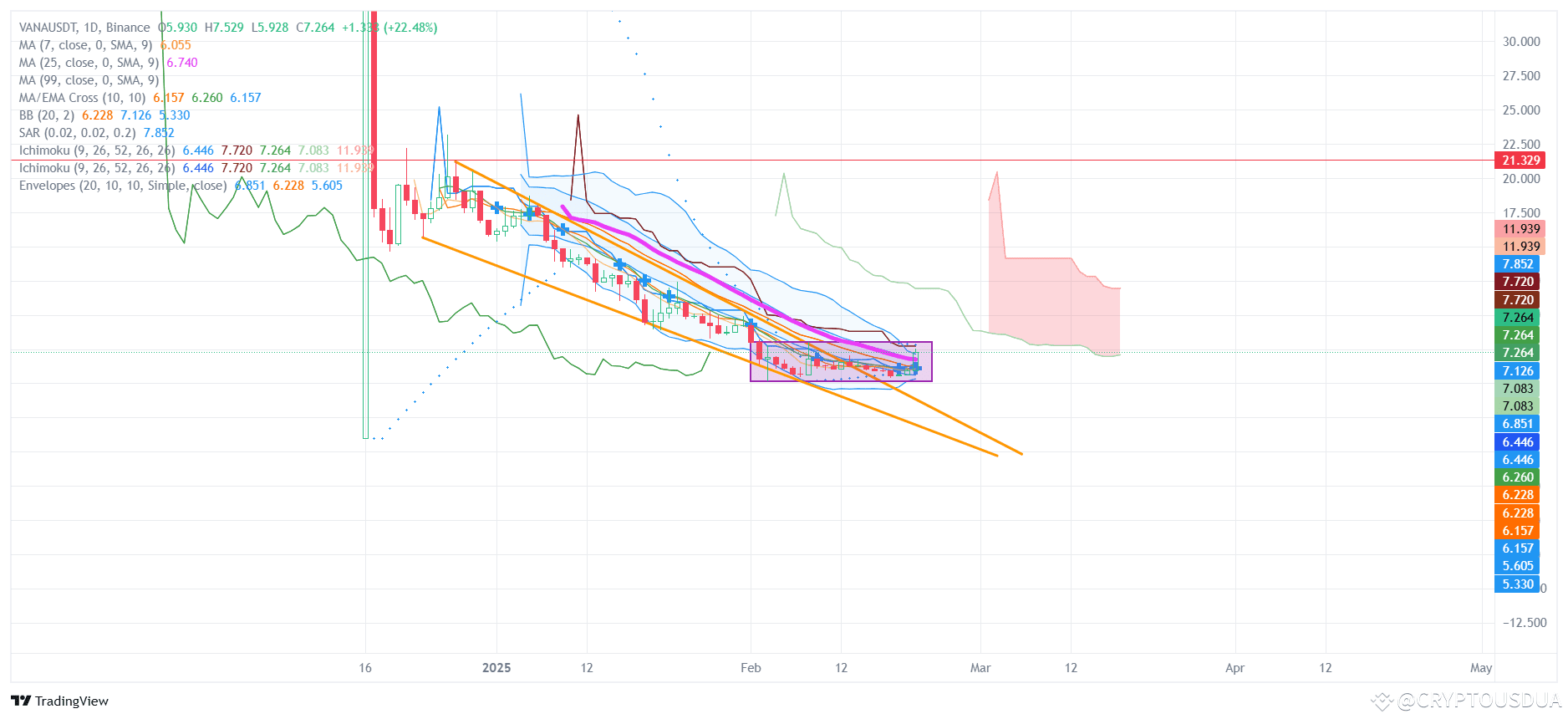 Если цена закрепится выше 7.264 USDT, это может стать сигналом к началу восходящего движения. Следующие цели: