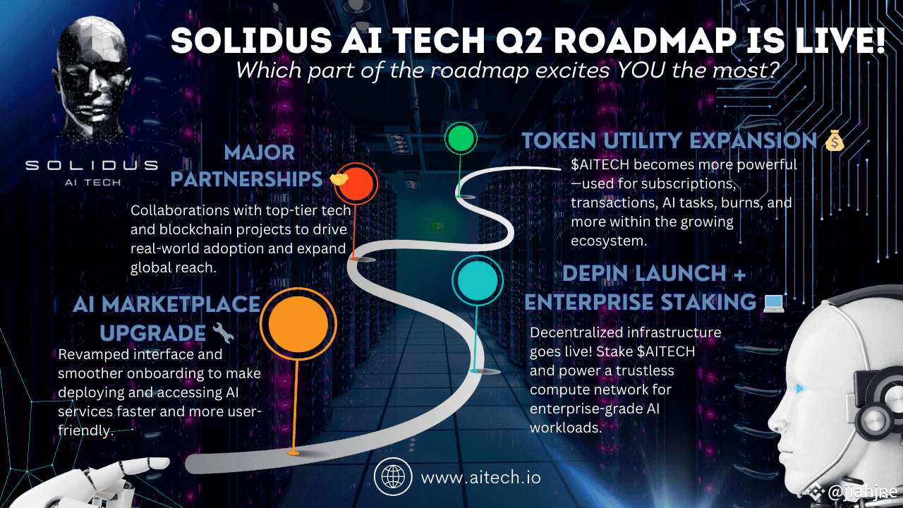 #Solidus #AITECH just unveiled its Q2 #RoadMap2025 —and it’s packed with game-changing updates that reinforce its position as a leader in #Aİ + #Web3 infrastructure. With an ambitious rollout of marketplace upgrades, DePIN deployments, top-tier partnerships, and utility-driven tokenomics, Solidus isn’t just participating in the AI race—it’s building the track.