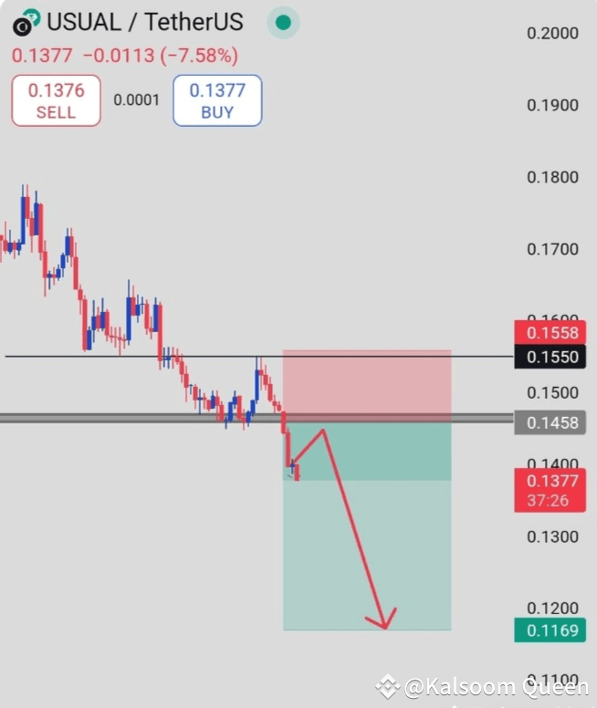 The USUAL token has exhibited clear signs of weakness after facing a decisive rejection at the $0.1450 resistance barrier. This failure to break higher has resulted in a sharp downward movement, effectively validating a bearish continuation pattern. The former support level has now been flipped into resistance, reinforcing the current bearish structure and signaling that sellers maintain firm control of market direction.