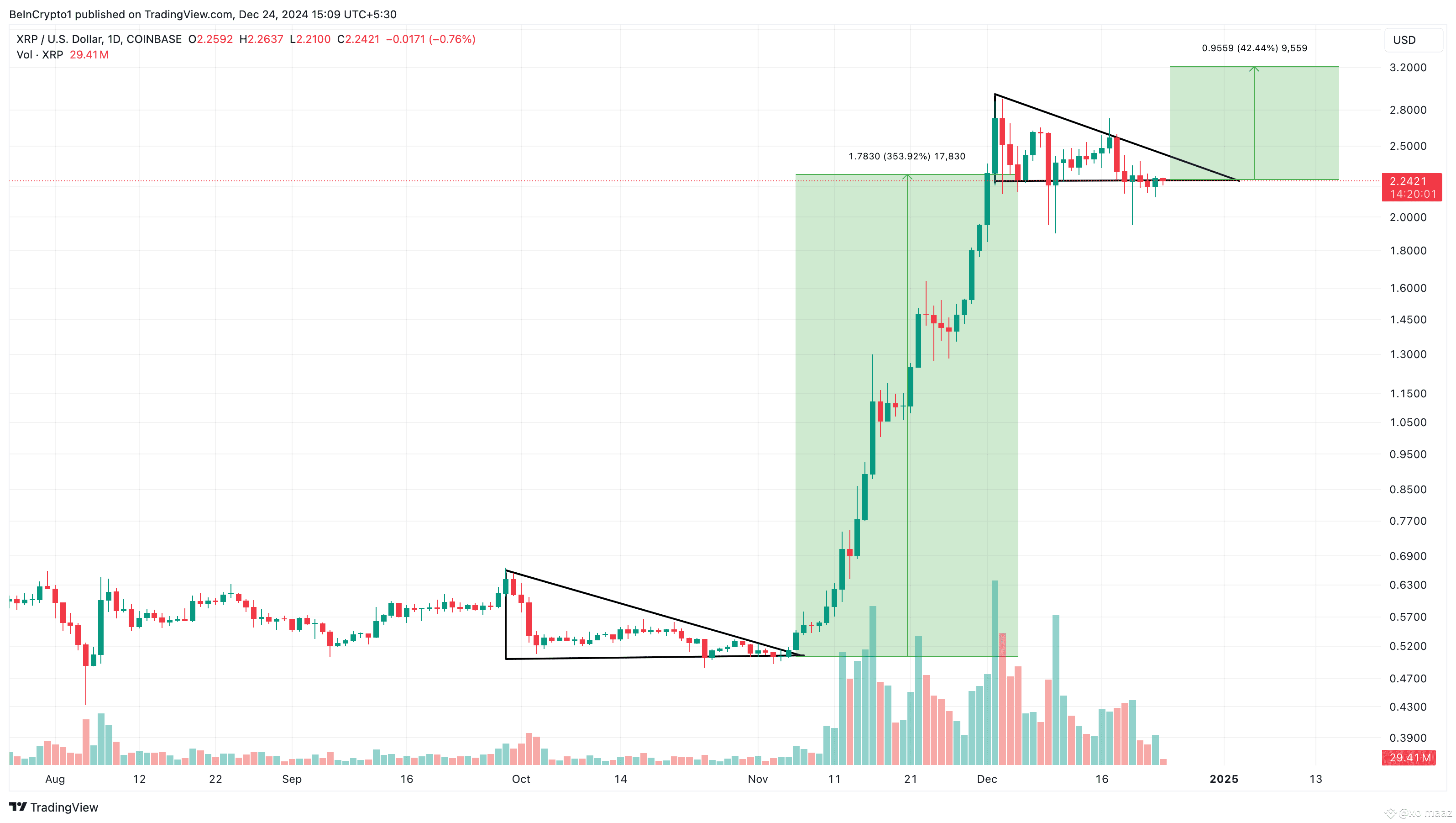 A cup and handle pattern has emerged on the daily timeframe, with XRP consolidating between $2.40 and $2.70, forming the handle portion.