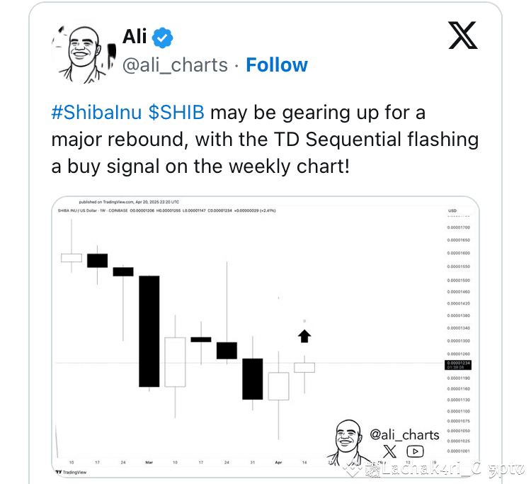 Crypto analyst Ali Martinez supports the case for a potential rally by pointing to a major rebound forming in Shiba Inu. On the weekly chart, the TD Sequential indicator has flashed a buy signal, indicating the potential for a fresh recovery.