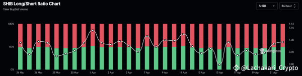This shift has brought the long-to-short ratio up from 0.8936 to 0.9908, indicating a more balanced market sentiment. As bullish positions gradually increase, the probability of a breakout in Shiba Inu continues to rise.