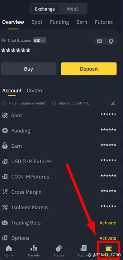 • Launch the Binance app and tap on “Wallets” at the bottom.