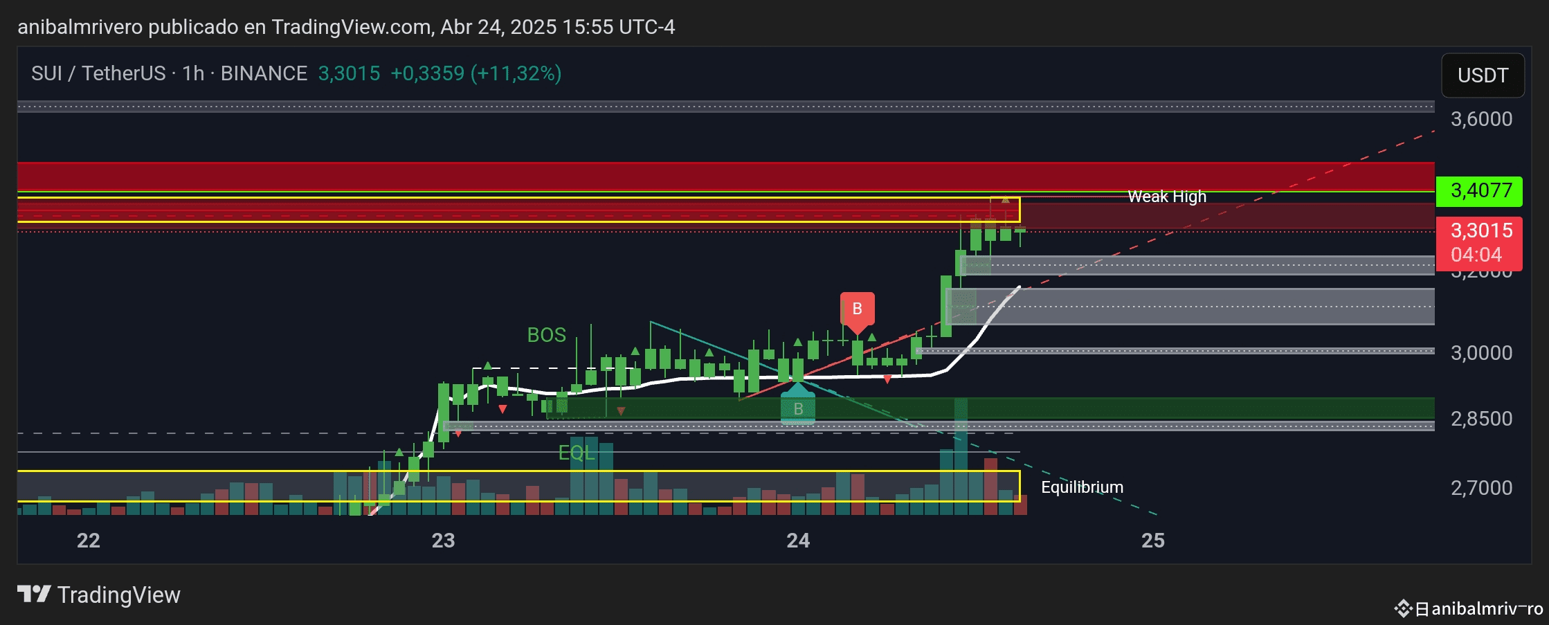 * Entrada: Una posible entrada se podría considerar tras la confirmación de la ruptura del "Weak High", idealmente con una vela horaria cerrando por encima de este nivel con un volumen decente. Otra opción, más conservadora, sería esperar un pequeño retroceso post-ruptura para buscar una entrada en un nivel de soporte recién creado.