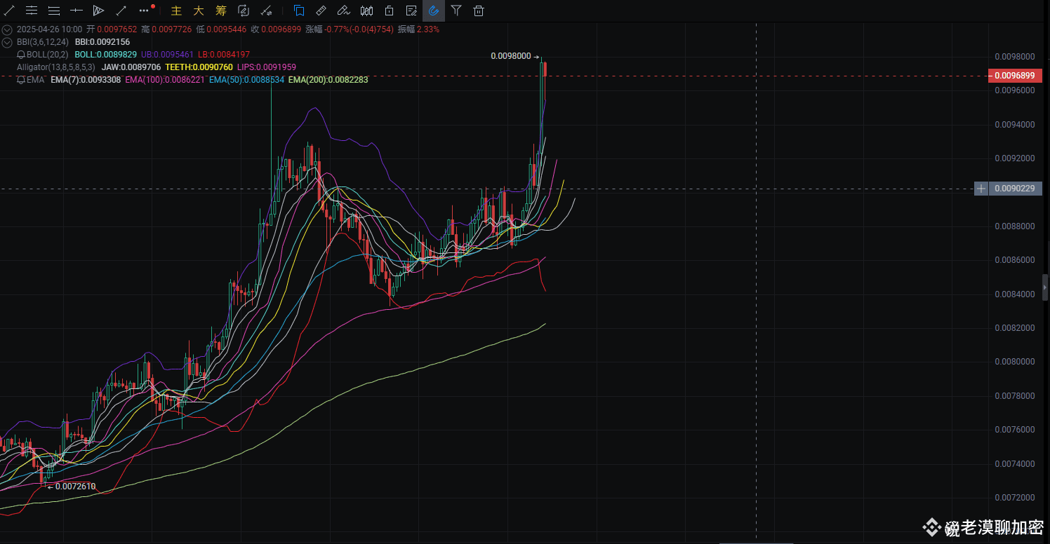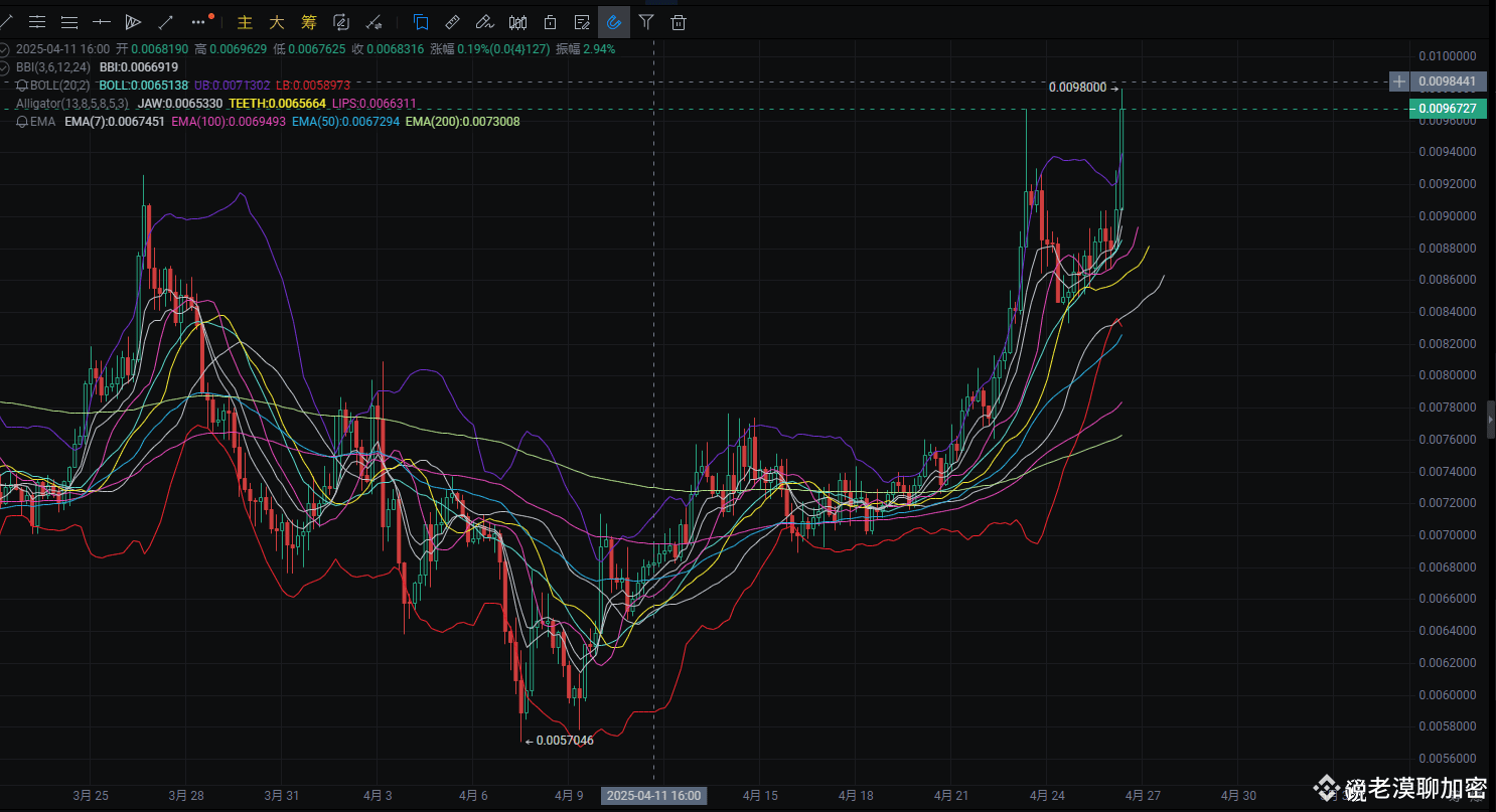4月25日PEPE在突破0.0090大关后出现急拉,但随后上影线拉长,日线收出冲高回落小阴线,预示着上方压力沉重。