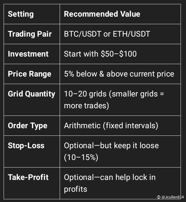 Goal: Profit from price swings in a sideways market (e.g., BTC/USDT, ETH/USDT)