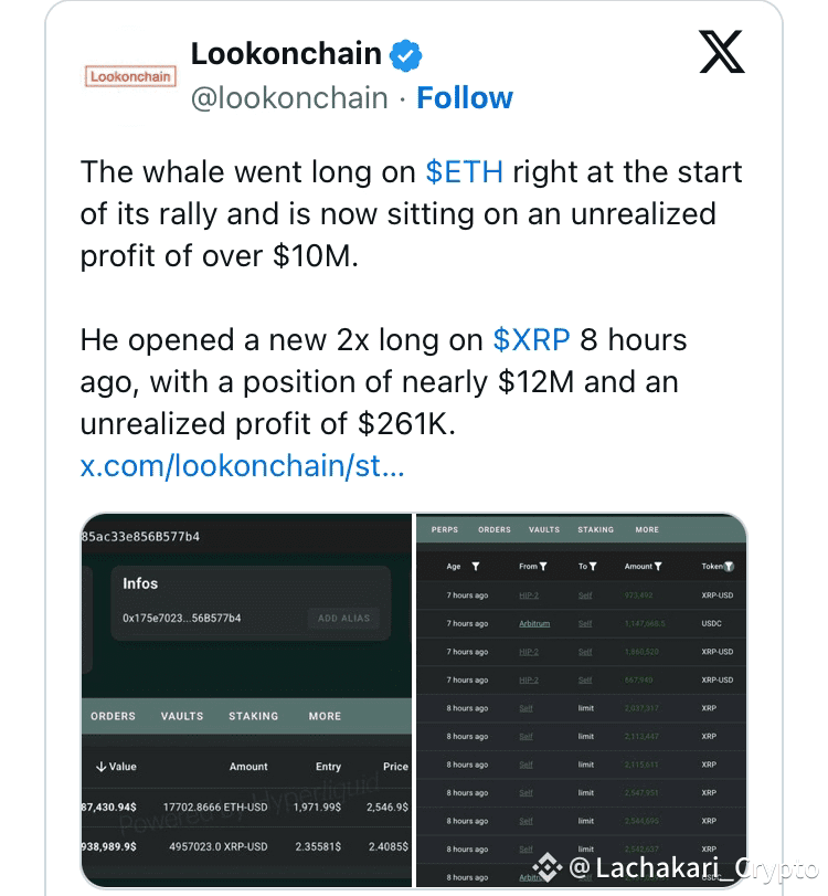 This successful execution appears to have laid the groundwork for the next strategic step. Now, the same whale shifted focus to XRP, opening a 2x leveraged position valued at nearly $12 million.