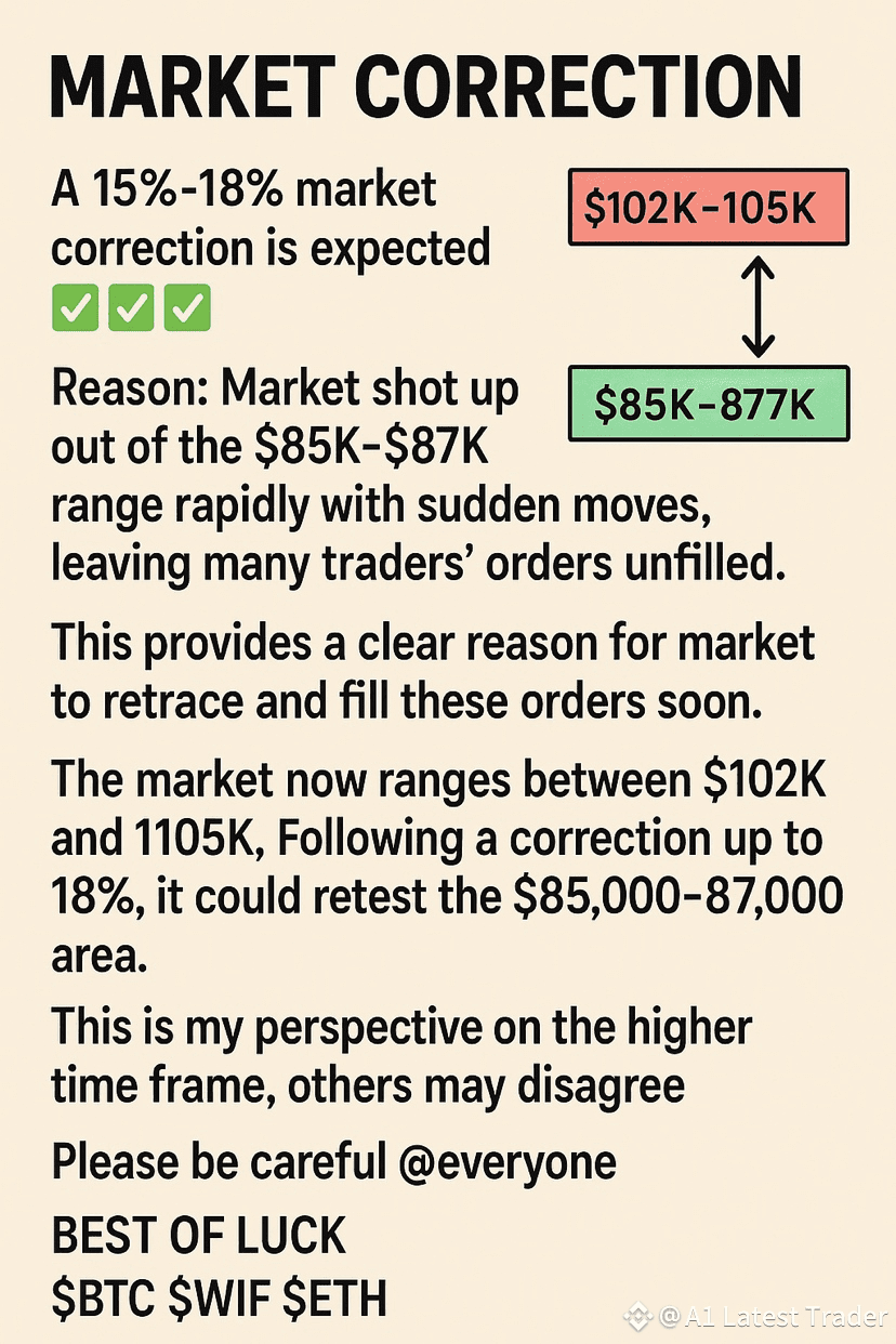 The cryptocurrency market is currently signaling a potential correction between 15% to 18%, especially in major assets like Bitcoin (BTC), Ethereum (ETH), and WIF.