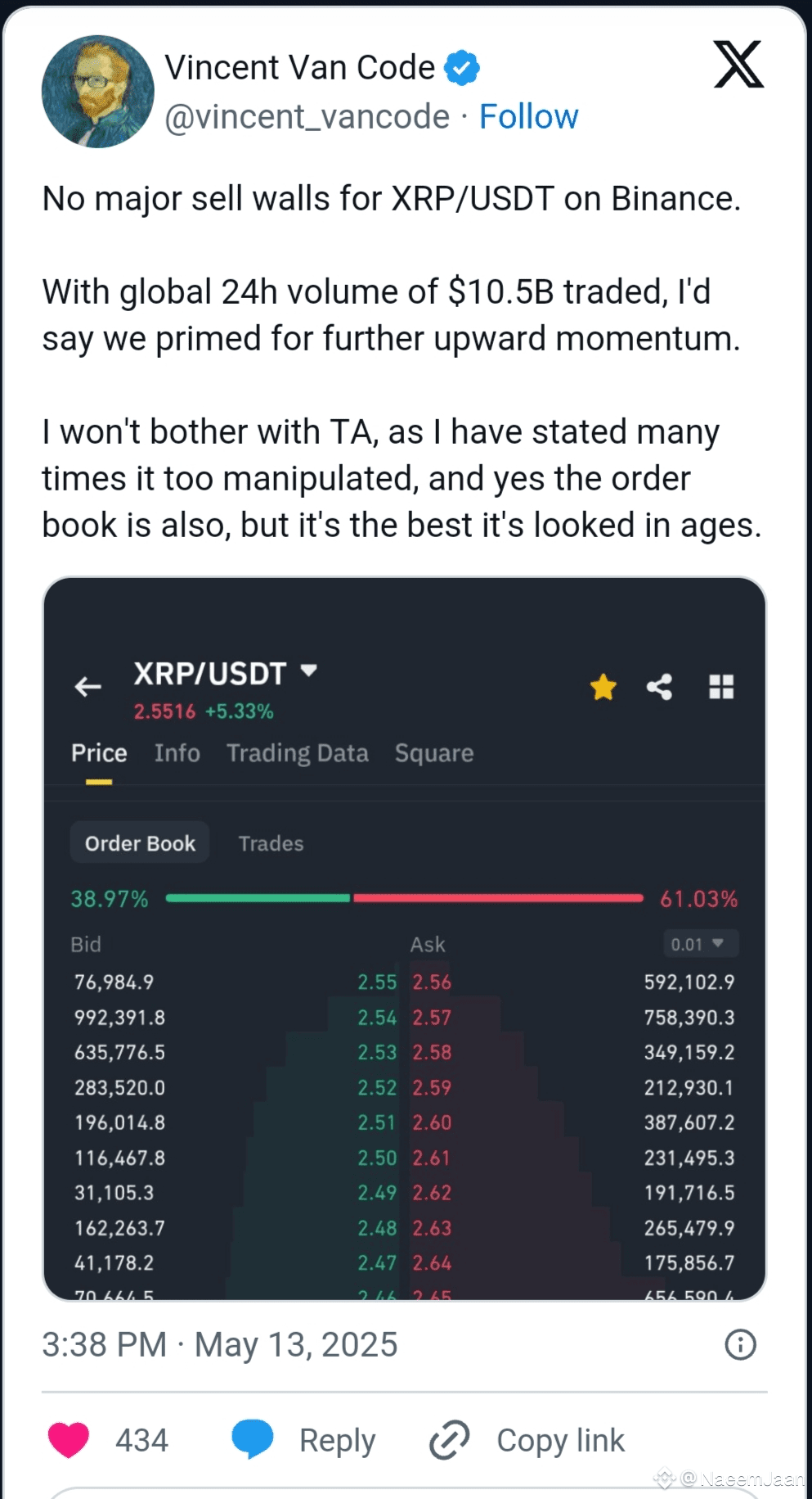 In a recent post, he noted there are currently no major sell walls for XRP on Binance, and emphasized that with a global 24-hour volume of $10.5 billion traded, the market appears “primed for further upward momentum.”While he dismissed technical analysis as overly manipulated, Van Code acknowledged that while the order book has similar problems, its current state is “the best it’s looked in ages.”