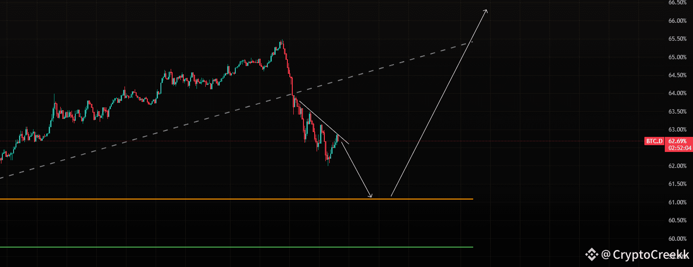 BTC.D should continue to fall to its Fib level below before seeing any rebound. Alts are looking good here.