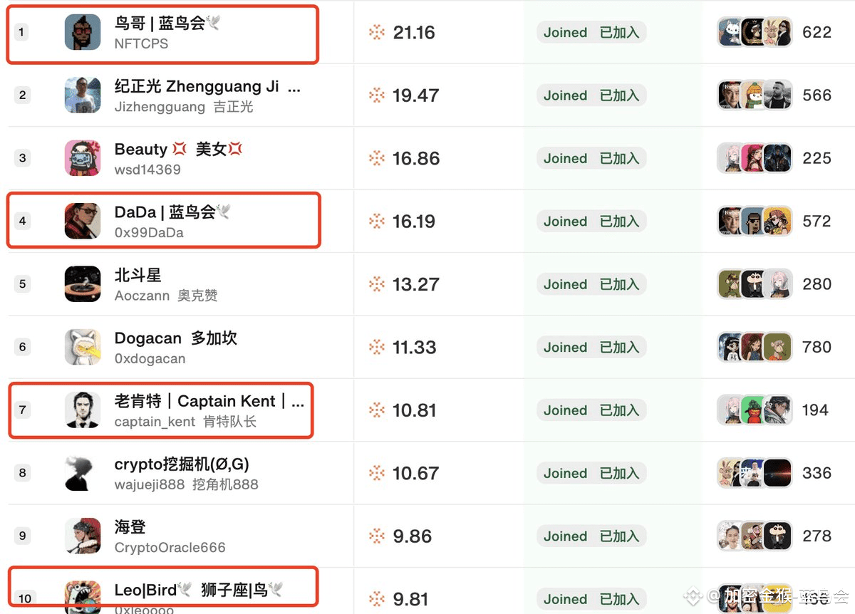 榜首是鸟哥 @NFTCPS ,后面跟着一票“小鸟” @0x99DaDa 、 @captain_kent 、 @0xleoooo