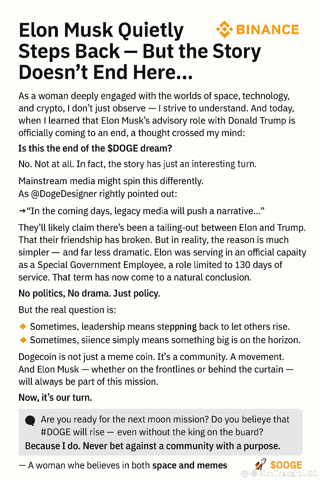As a woman deeply engaged with the worlds of space, technology, and crypto, I don't just observe — I strive to understand. And today, when I learned that Elon Musk’s advisory role with Donald Trump is officially coming to an end, a thought crossed my mind: