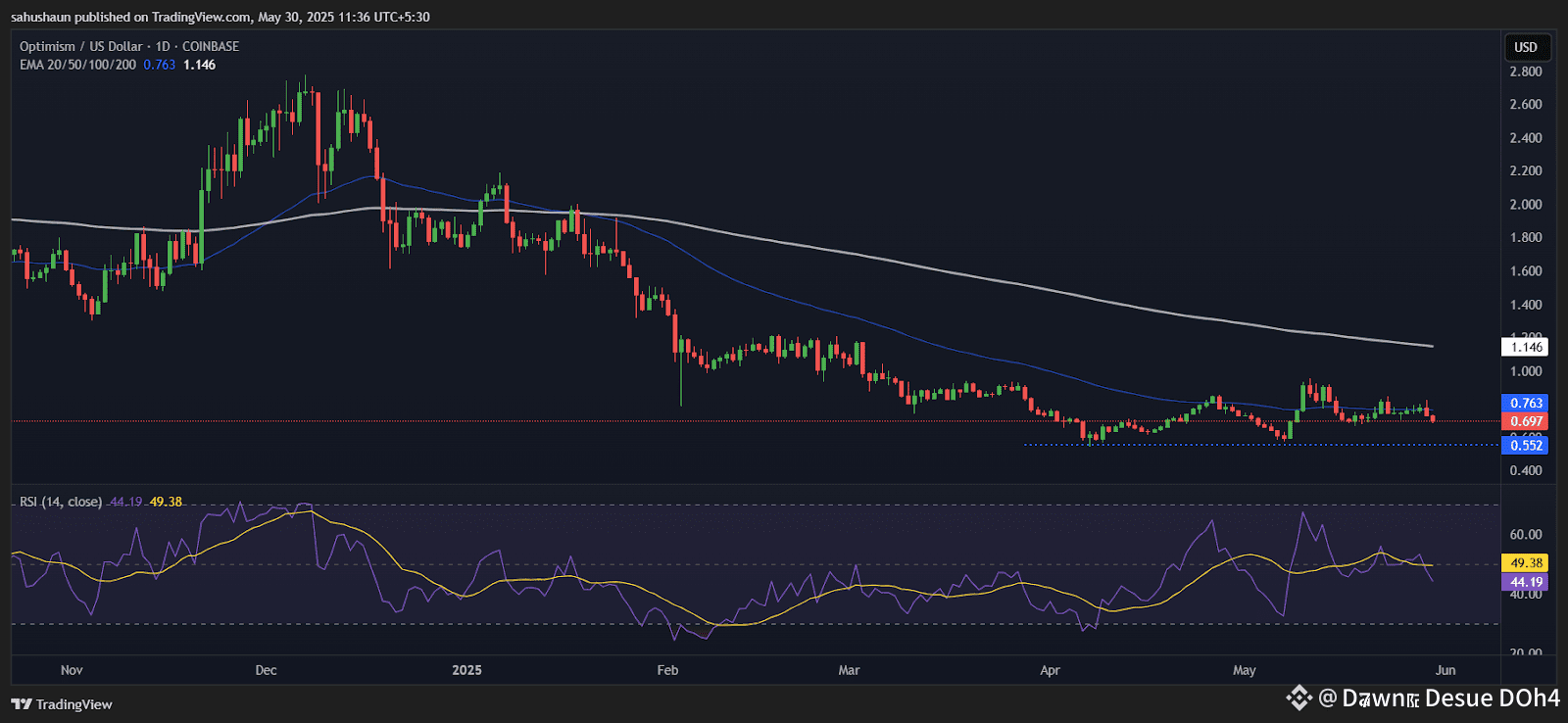 OP remains trapped in the descending channel since the late 2024 peak, currently at $0.696