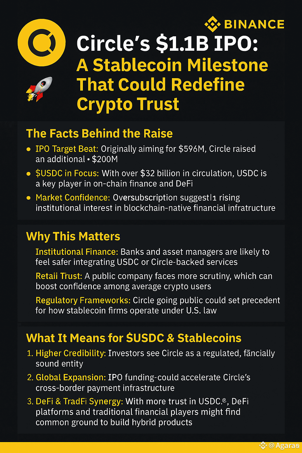 #CircleIPO #Web3 #USDC✅ #Stablecoins 🚀 In a bold leap toward mainstream financial legitimacy, Circle, the company behind the second-largest stablecoin $USDC, has successfully raised $1.1 billion through its expanded IPO — selling 34 million shares at $31 each. This move not only exceeded its original $896M target, but also potentially puts the company’s market valuation at a striking $6.9 billion.
