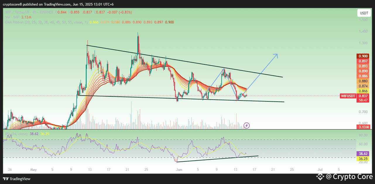 This chart shows that WIF/USDT is likely to turn bullish. The price is moving inside a falling wedge pattern, which is usually a bullish reversal signal. The price has bounced from the lower support line and is now aiming higher. The RSI indicator shows a bullish divergence—while the price made a lower low, the RSI made a higher low—suggesting that buyers are gaining strength. The EMA ribbon is above the price, but a breakout could push through it. If price breaks the wedge’s top line, it may move up toward the $0.90 zone. Overall, the chart suggests a potential strong upward move is forthcoming.