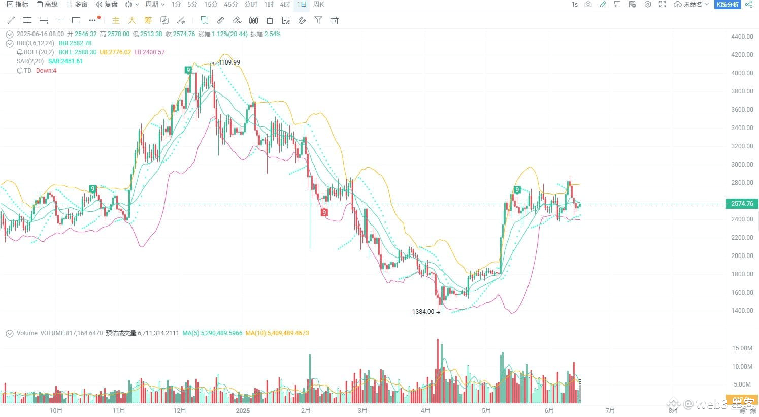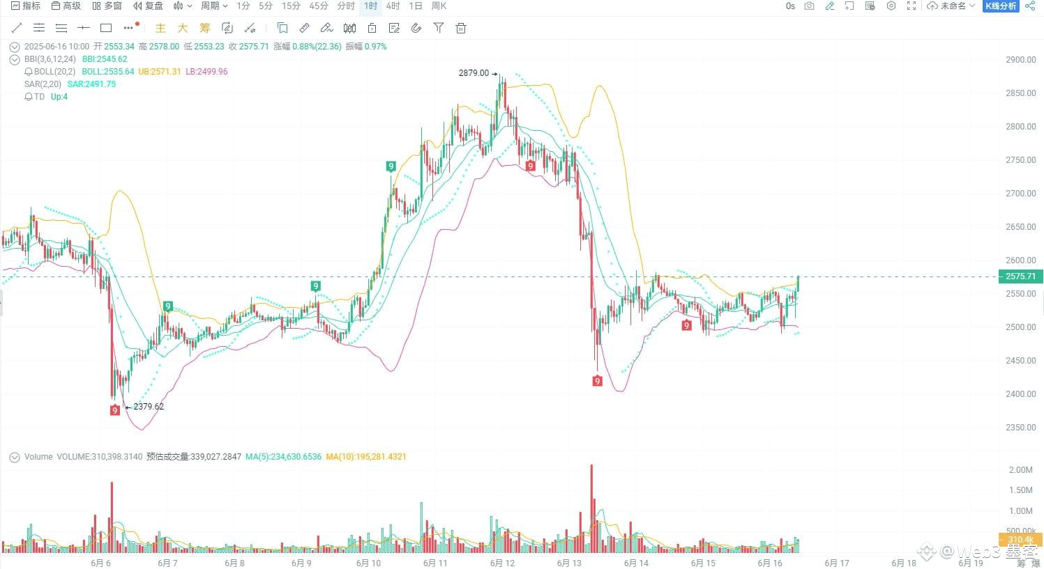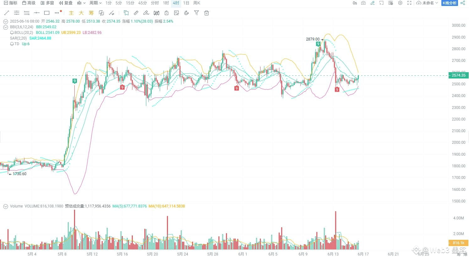 【日线分析】:趋势结构:ETH自5月初突破1730以来形成一波主升浪,最高至2879,近期回踩至2450后出现明显企稳迹象。