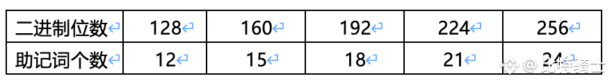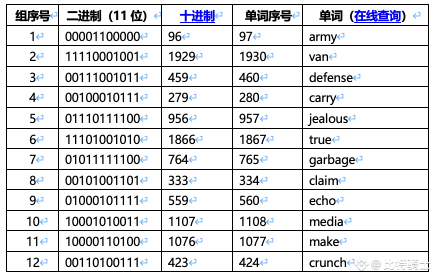 4) 将这132位,每11位分为1组,共12组。为什么 11 位一组,因为BIP39 词表有 2048 个单词(2^11 = 2048),随后将这12组对应的映射为12个助记词