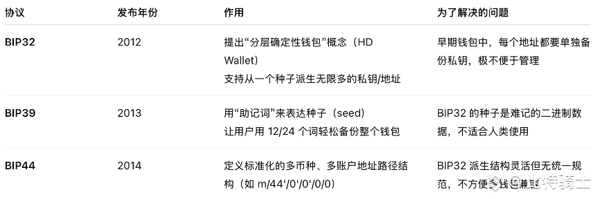 为了解决随机钱包的缺陷,比特币开发者社区在2012年,2013年,2014年分别建立了三个标准协议,分别是BIP32,BIP39,BIP44(BIP,Bitcoin Improvement Proposal),最终形成了现在主流钱包的架构基础。