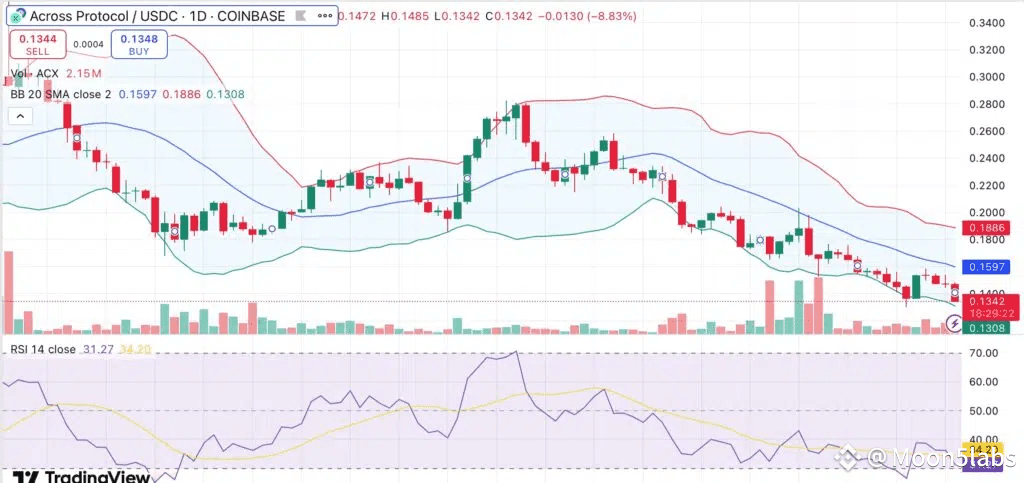The charts are grim. ACX is hovering near the lower Bollinger Band at $0.1308, well below its 20-day simple moving average of $0.1597. The Relative Strength Index (RSI) has dropped to 31.27, flirting with the oversold zone.
