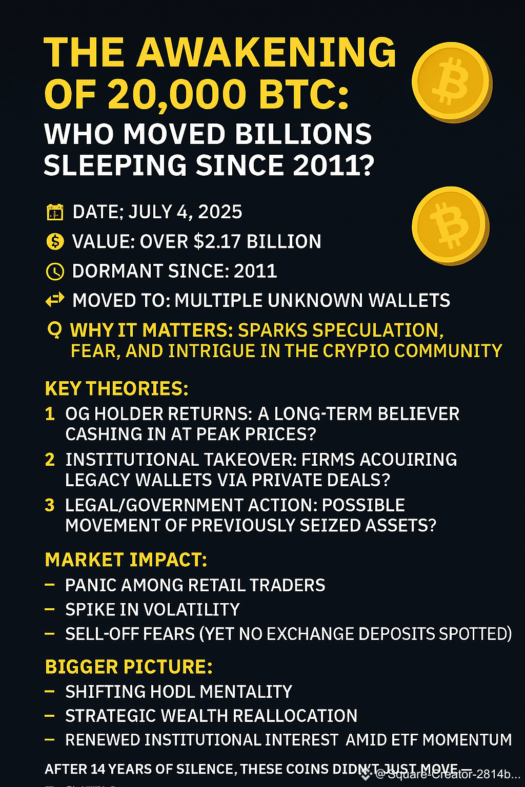 في الرابع من يوليو 2025، شهد سوق العملات الرقمية حدثًا استثنائيًا هز مجتمع الكريبتو بأكمله: تم تحريك 20,000 بيتكوين، ظلت نائمة في محافظها منذ عام 2011 — أي منذ أكثر من 14 عامًا. هذه الكمية الهائلة، التي تُقدّر قيمتها السوقية الحالية بأكثر من 2.17 مليار دولار، أثارت عاصفة من التساؤلات والسيناريوهات: من حرّك هذه الأموال؟ ولماذا في هذا التوقيت بالذات؟ وما التأثير المحتمل على السوق؟