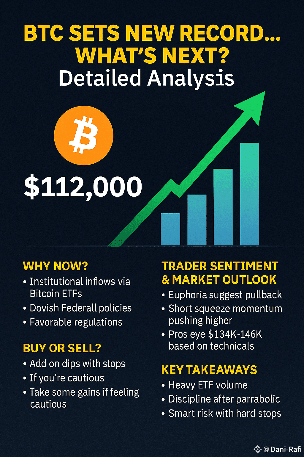 Market pros are giving mixed guidance right now. Long (Bullish) View: Traders inclined to stay long argue the fundamentals underpin continuing growth. They cite the heavy institutional flows and the fact that on-chain and ETF demand still outstrips new supply. If Bitcoin holds above ~$112K, breakout traders will eye targets in the mid-six figures (some models even point to $130K–$150K before any major pause). For those bullish on the trend, accumulating on dips (for example near the $107K support area) could make sense, using stop-loss orders to manage risk. In fact, IG suggests new investors start with a small position and scale in gradually while using stops, emphasizing careful risk management.