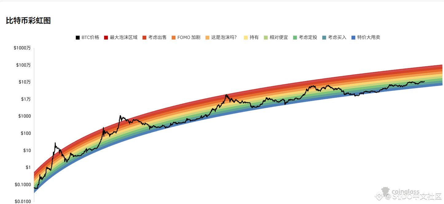 BTC 彩虹图 是一种基于比特币长期对数价格走势,结合多个历史周期的回归带宽绘制的估值可视化工具。