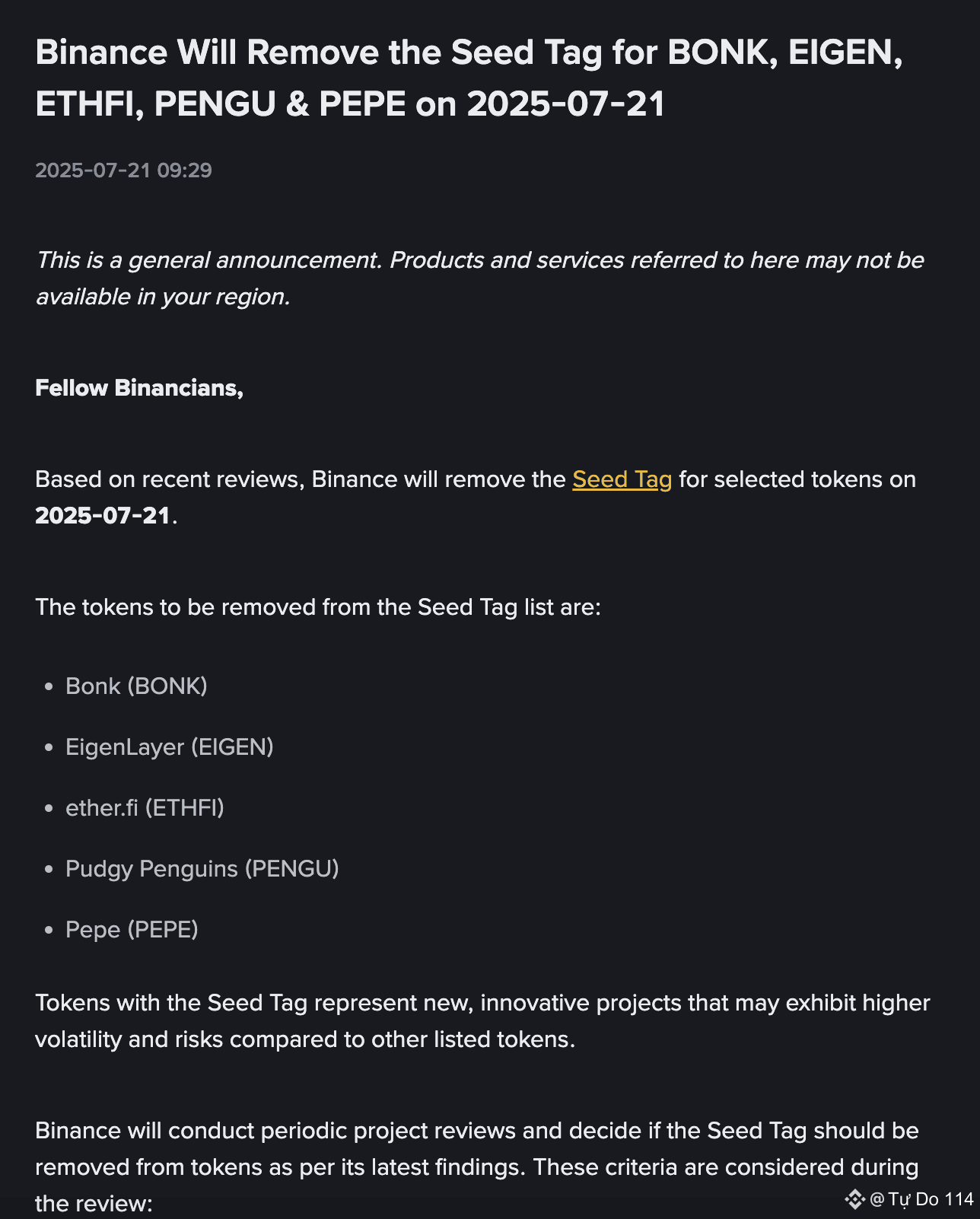 $BONK $PEPE $PENGU Theo thông báo từ Foresight News, sàn giao dịch Binance sẽ chính thức gỡ bỏ nhãn "Seed Tag" (Nhãn Hạt Giống) khỏi các đồng tiền mã hóa BONK, EIGEN, ETHFI, PENGU và PEPE trong ngày hôm nay.