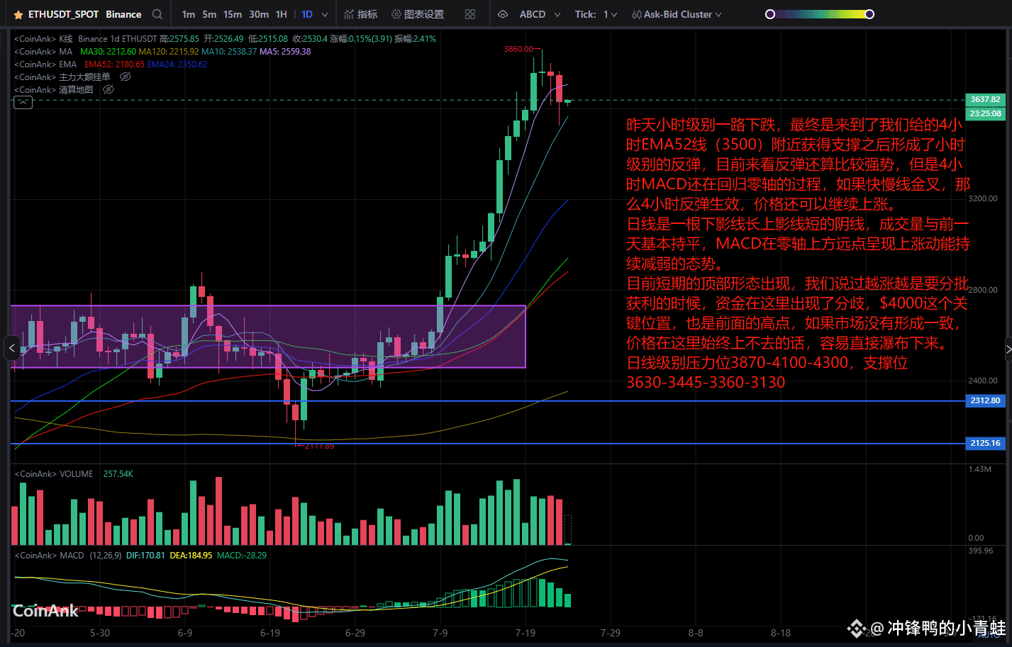 日线级别压力位3870-4100-4300,支撑位3630-3445-3360-3130