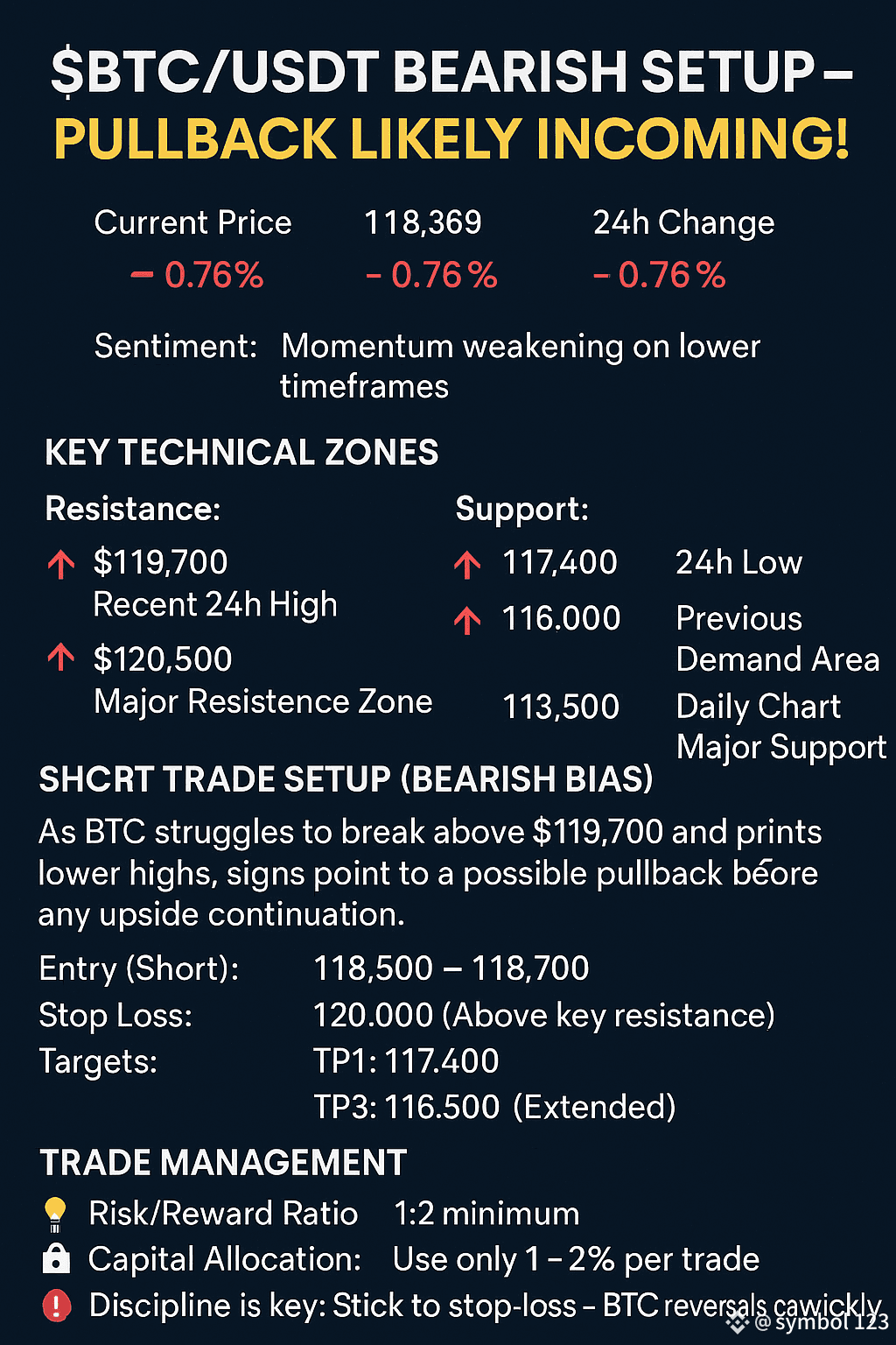 BTC struggles to break above $119,700 and prints lower highs, signs point to a possible pullback before any upside continuation.
