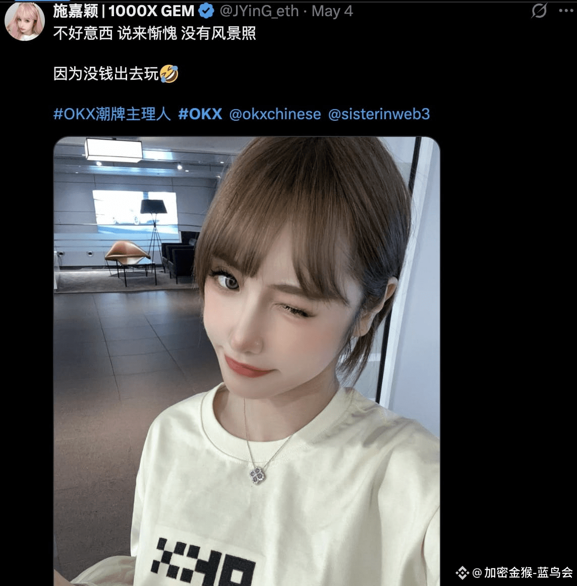 随着关注度上升,施嘉颖号开始接一些项目推广和商务合作。她曾参与 Bitget 交易所的活动,身穿Bitget连帽卫衣拍照发推称“足球里的危机就是转机…谢谢Bitget的卫衣,穿一起真好看”来蹭热点 。也与 OKX 官方互动,参加其潮牌旅行摄影活动并中奖,在推文中晒出奖品福利抽奖,赢得不少用户评论互动。表面看来,这位美女KOL活跃又受宠,资源、人缘两手抓。