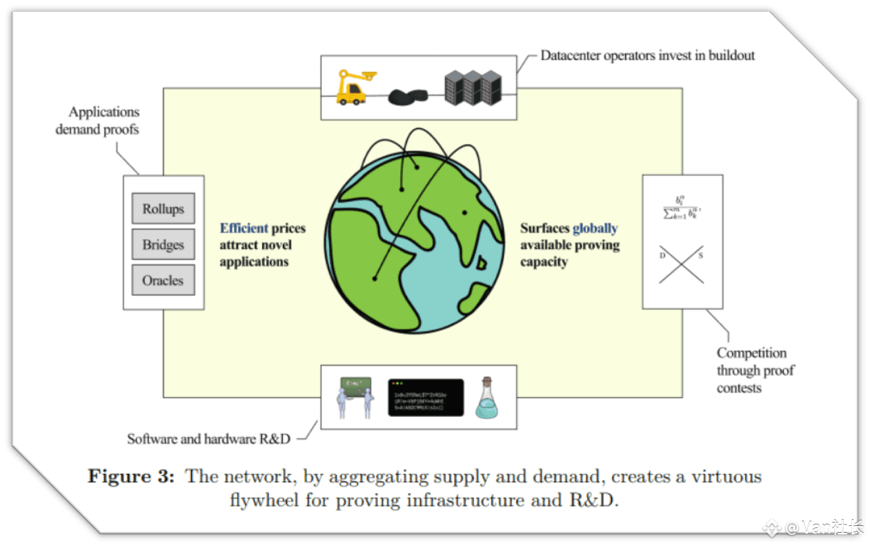 Prove代币的经济设计巧妙地平衡了供给与需求😎。在Succinct Network中,用户支付的费用通过全支付拍卖机制分配,大部分奖励给高效的证明者。这就像一个良性循环的市场:需求汇聚推动基础设施投资,透明定价加速硬件优化,而无许可参与则确保了证明者的多样性。参考比特币的工作量证明或Filecoin的存储证明,Prove代币借鉴了这些前辈的精华,却更注重ZK证明的独特挑战——如最小化延迟和成本。