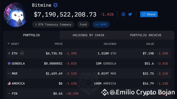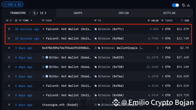 Meanwhile, data from Arkham shows Bitmine now holds over $7 billion in #Ethereum (1.51M $ETH ), cementing its position as one of the largest corporate treasuries in crypto. On-chain flows reveal consistent multi-million-dollar $ETH transfers, highlighting aggressive buying behavior despite market volatility.