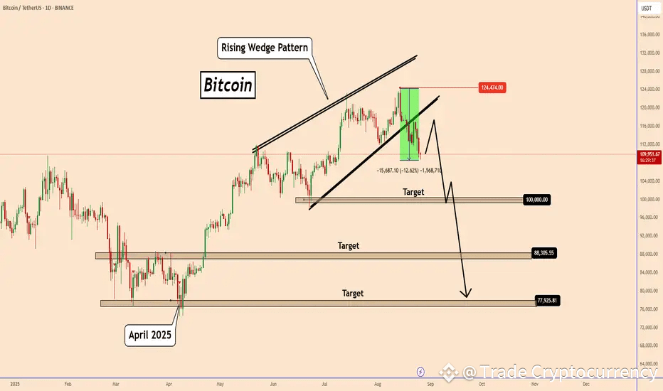 While this could be a normal dip in a strong uptrend, the current setup looks more complicated. BTC has confirmed a large Rising Wedge Pattern—a bearish signal that suggests the price might fall further.