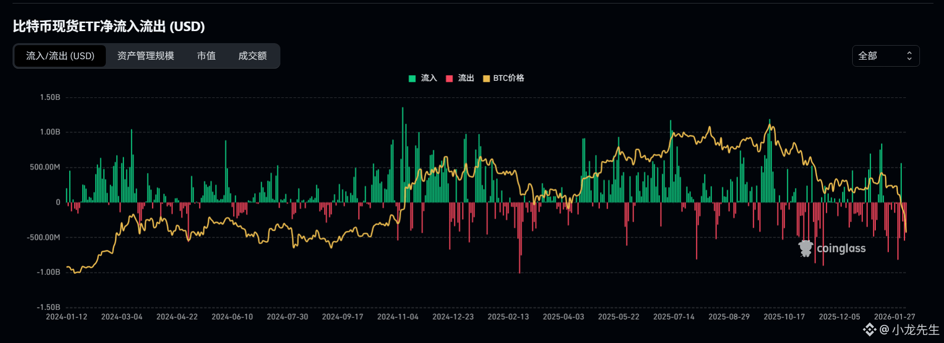 ETF机构最近三个月都是保持资金净流出的状态,这两天比特币快速下跌,ETF机构依然是减持比特币的主力军,昨天净流出5.45亿美金,今天净流出4.34亿美金。从最近两年的资金流向来看,比特币价格疯狂上涨至顶部的时候,ETF机构资金净流入越大;相反,等到有一天,比特币快速暴跌并插针到真正市场底部价位的时候,则是ETF机构资金净流出较大金额的一天。成也ETF,败也ETF。我们可以简单地认为,ETF机构是助涨助跌的比特币大号韭菜机构。目前比特币处于熊市中后阶段和中线下跌趋势,毋庸置疑,未来的几个月里,ETF机构依然会选择不断减持比特币,助推比特币跌至更低的底部价位。