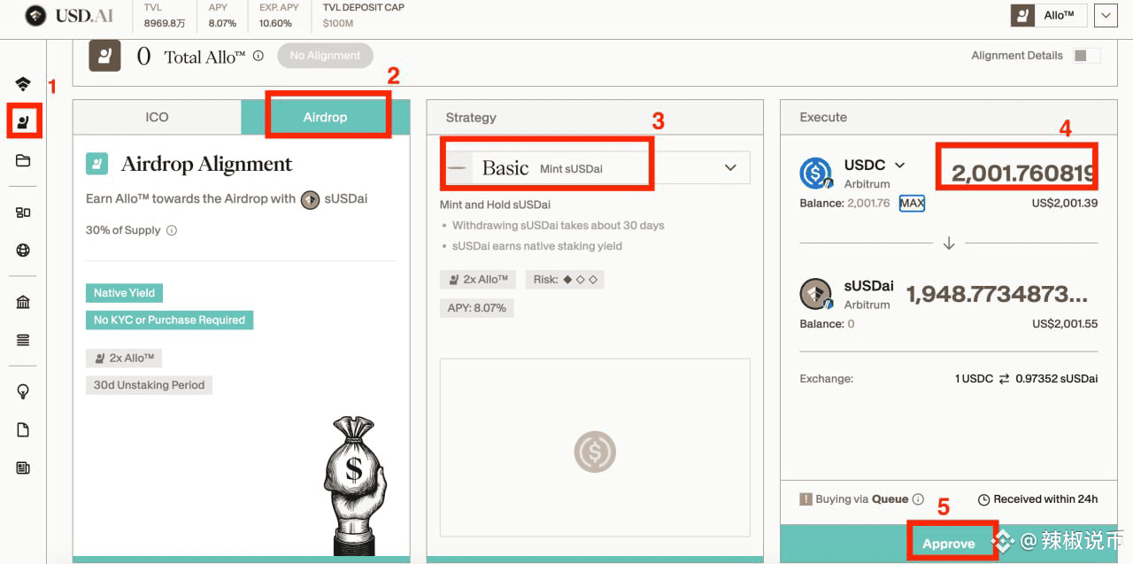 3⃣️依次选择“Allo,Airdrop,Basic”,然后输入你想存入的USDC数量(比如我这里存了2001USDC),最后点击“approve,deposit”即可